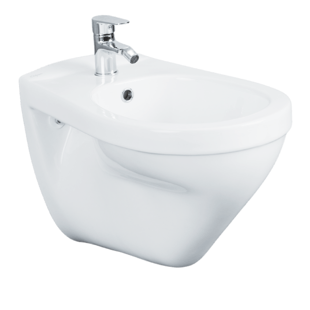 Bidet mural LILAS en porcelaine blanche, forme arrondie sophistiquée avec trou de robinet Ø 35. Livré avec kit de fixation dans un emballage carton individuel. Certifié EN 35.