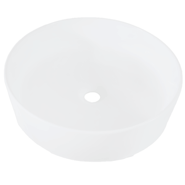 Vasque ronde à poser en grès fin, design circulaire épuré avec traitement antibactérien, disponible en blanc. Légère et facile à installer. Dimensions Ø 440 x 125 mm. Certifiée EN 31.